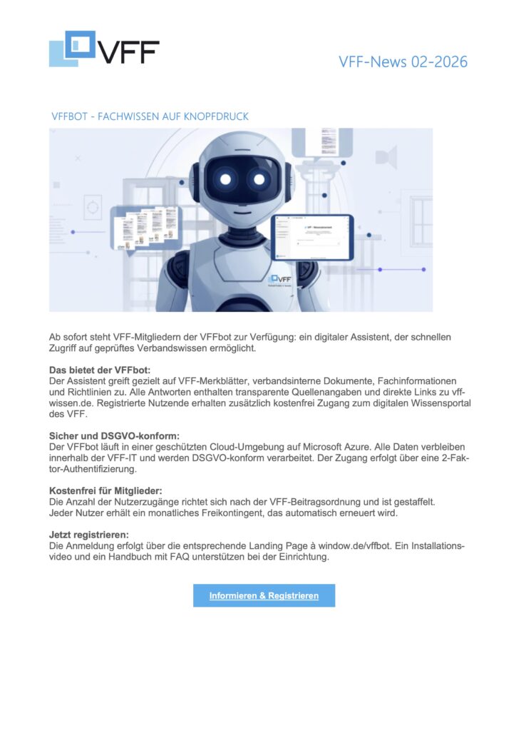 Der VFF e-Ticker informiert Sie ganz kompakt über alles, was sich in unserer Branche tut. Sie erhalten unseren Mehrwert-Newsletter 8- bis 10-mal im Jahr bequem per E-Mail. Hier können Sie sich direkt für den e-Ticker anmelden.